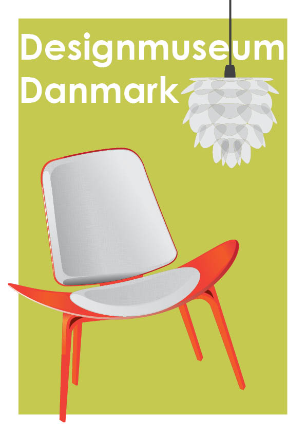 A poster design inspired by a visit to the Danish Design Museum in Copenhagen. I was influenced by the chairs in the museum lobby, bright red and in a mid century style, I was inspired to create a mid century style poster to match. After creating an illustration of the chair, I added the artichoke lamp, a background in a muted mid century pastel and a simple sans serif typeface.